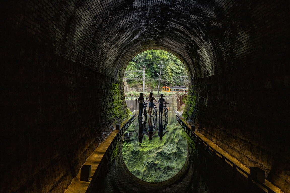 三貂嶺生態友善隧道全長 3.19 公里,是全台第一條「鋼筋自行車道」。最大亮點是隧道終點口(近三貂嶺車站那端)的「鏡面水池」設計,水池倒映著隧道和三貂嶺的綠意,拍照很好看!如果能捕捉到火車經過的畫面又更讚,是這裡最熱門的拍照打卡點。