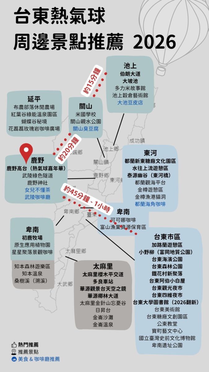 - 鹿野周邊住宿最方便、看完早上場還可以回去休息,但搶手;台東市區住宿選擇多,但車程約至少45分鐘-1小時,且需早起。